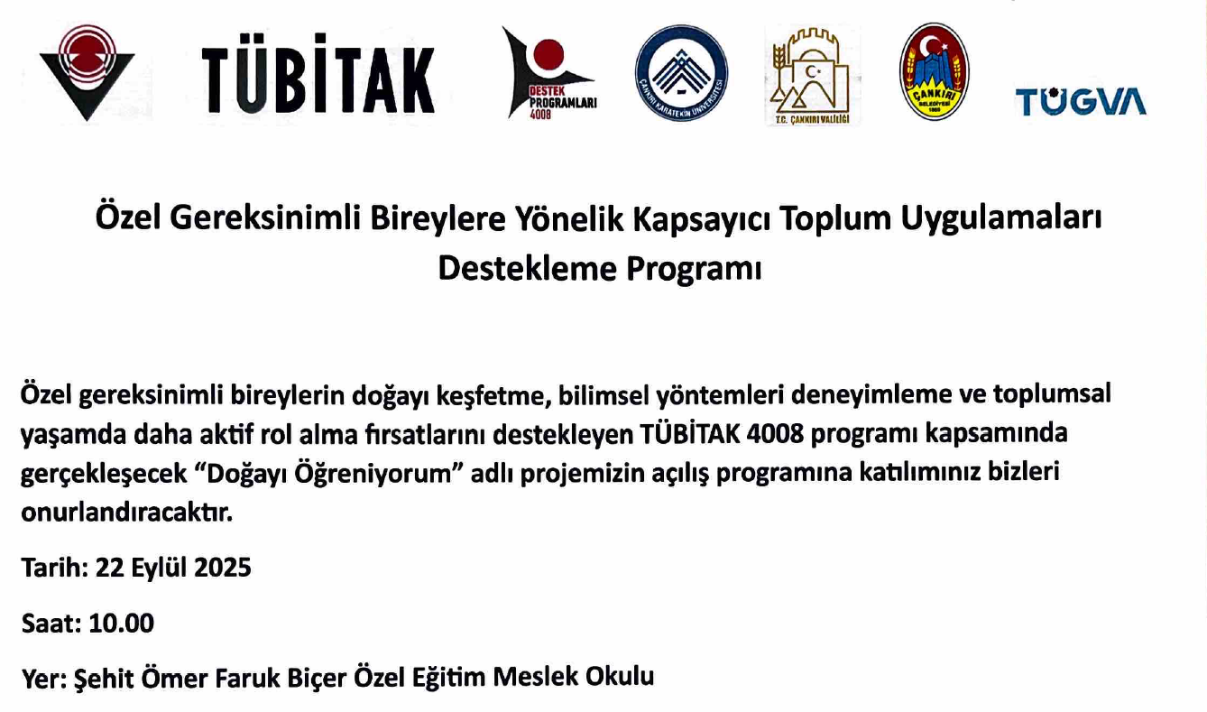 ÖZEL GEREKSİNİMLİ BİREYLERİN DOĞAYI KEŞFETME, BİLİMSEL YÖNTEMLERİ DENEYİMLEME VE TOPLUMSAL YAŞAMDA DAHA AKTİF ROL ALMA FIRSATLARINI DESTEKLEYEN TÜBİTAK 4008 KAPSAMINDA ÜNİVERSİTEMİZ İLE ÇANKIRI VALİLİĞİ, ÇANKIRI BELEDİYE BAŞKANLIĞI VE TÜRKİYE GENÇLİK VAKFI ÇANKIRI ŞUBESİNİN KATKILARIYLA “DOĞAYI ÖĞRENİYORUM” ADLI PROJENİN AÇILIŞ PROGRAMI YAPILACAKTIR.