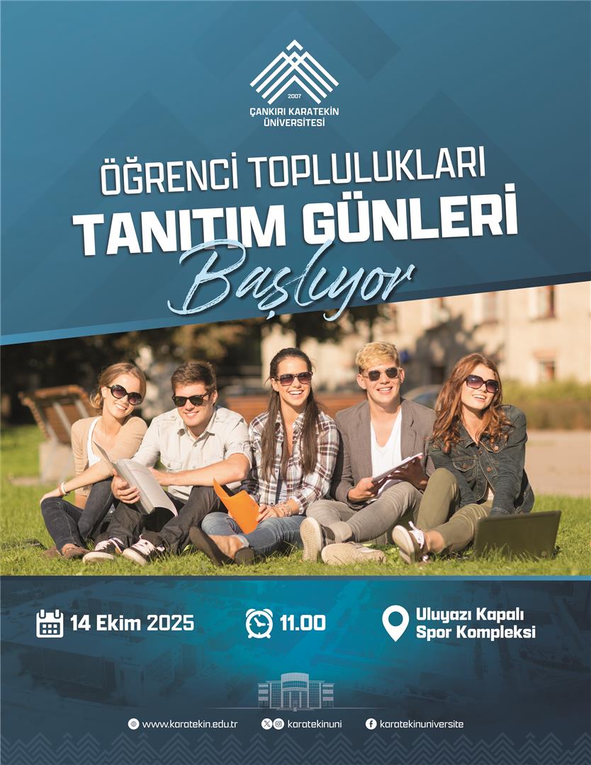 "ÖĞRENCİ TOPLULUKLARI TANITIM GÜNLERİ" 14 EKİM 2025 SALI GÜNÜ SAAT: 08:00 - 17:00 ARASINDA SKS KAPALI SPOR KOMPLEKSİ`NDE YAPILACAKTIR. TANITIM GÜNLERİ AÇILIŞ PROGRAMI SAAT: 11.00`DE GERÇEKLEŞTİRİLECEKTİR.