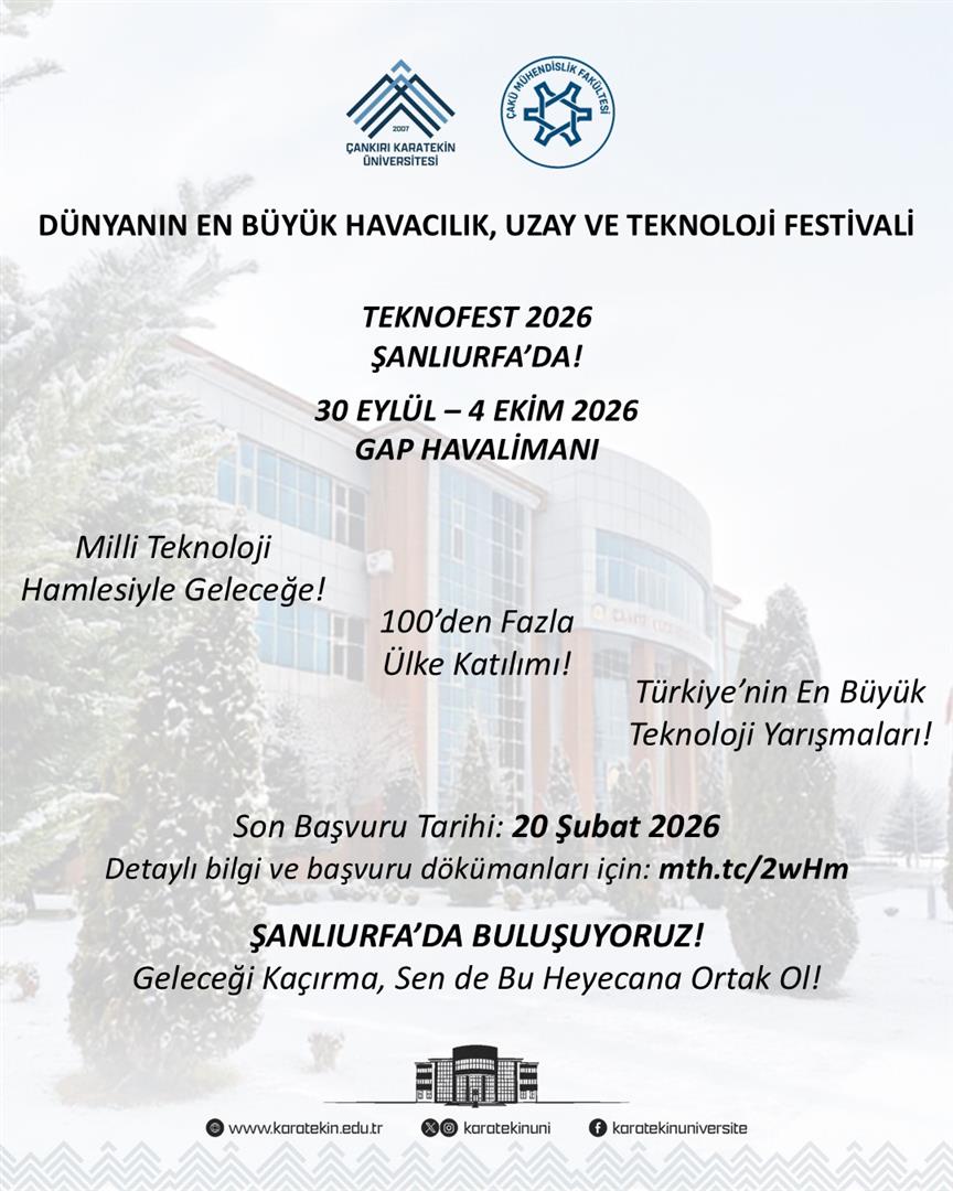TEKNOFEST 2026, MİLLİ TEKNOLOJİ HAMLESİ VİZYONU DOĞRULTUSUNDA 30 EYLÜL – 4 EKİM 2026 TARİHLERİ ARASINDA ŞANLIURFA GAP HAVALİMANI’NDA DÜZENLENECEKTİR. DÜNYANIN EN BÜYÜK HAVACILIK, UZAY VE TEKNOLOJİ FESTİVALİ OLAN TEKNOFEST; TEKNOLOJİ YARIŞMALARI, BİLİMSEL ETKİNLİKLER, HAVA GÖSTERİLERİ VE GİRİŞİMCİLİK FAALİYETLERİYLE GENÇLERİ VE TEKNOLOJİ MERAKLILARINI BİR ARAYA GETİRMEKTEDİR.